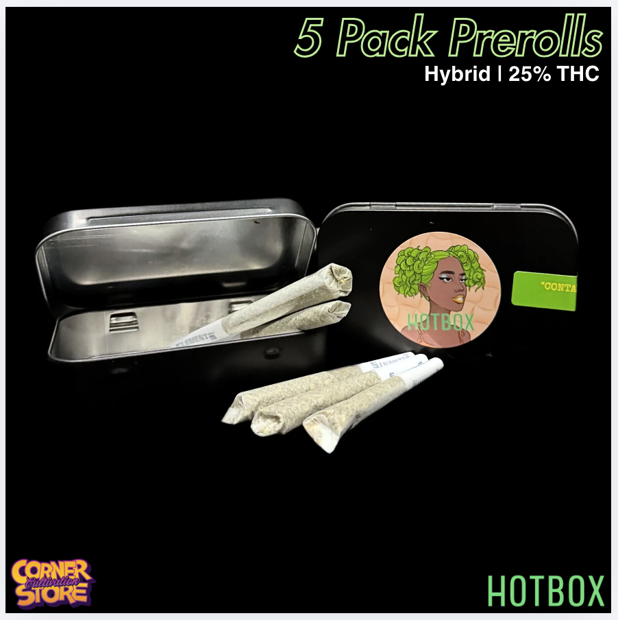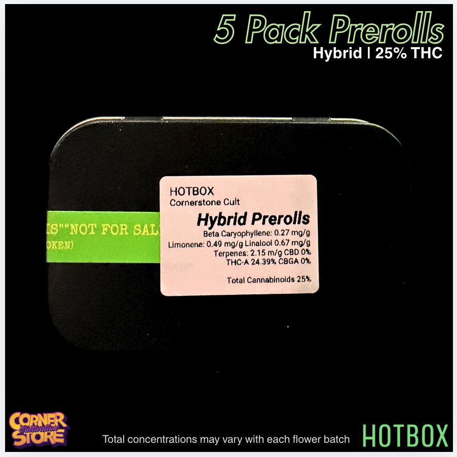 HOTBOX’s 5 Pack Prerolls with Cornerstore Cultivation’s top hybrid strains are packed at HOTBOX and feature a rotating selection of premium hybrid flower from Cornerstore Cultivation, delivering balanced flavor and smooth, consistent burns in every roll. Expect a mix of sweet candy notes, light citrus, and subtle gas depending on the featured batch. The hybrid profile offers the best of both worlds—an uplifting, euphoric head buzz paired with mellow body relaxation—perfect for social sessions, creative moments, or easygoing evenings.