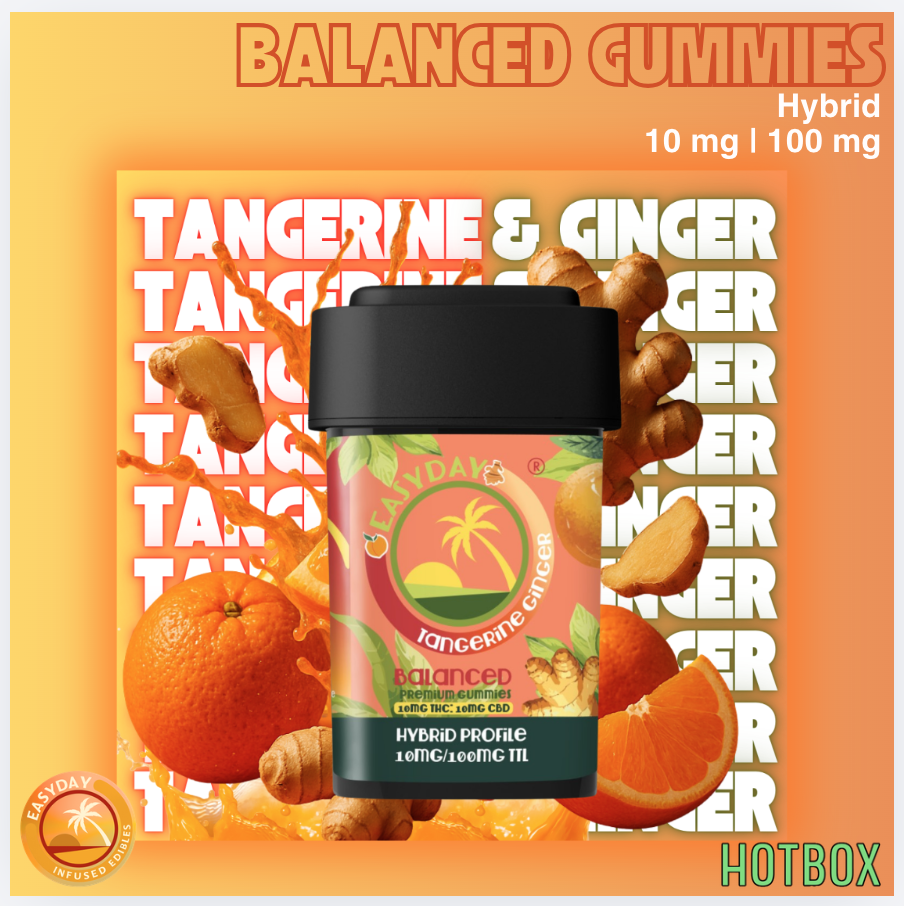 Balanced Gummies (10 mg/100 mg) by EasyDay Edibles blend the flavors of tangerine and ginger to create the experience of perfect harmony. This unique hybrid combines the uplifting citrus notes of tangerine with the warming spice of ginger, while delivering an equal balance of THC and CBD for a well-rounded experience.