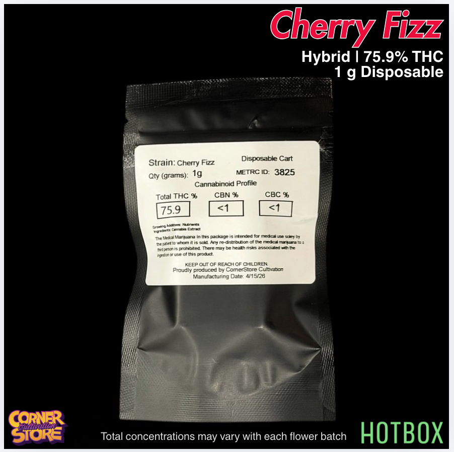 Cherry Fizz Disposable Vape (1 g) by Cornerstore Cultivation offers a sweet, sparkling blend of ripe cherry and effervescent candy notes, backed by the clean, top-shelf vapor quality Cornerstore is known for. As a hybrid, expect a balanced, euphoric experience that eases both mind and body — great for any time of day.