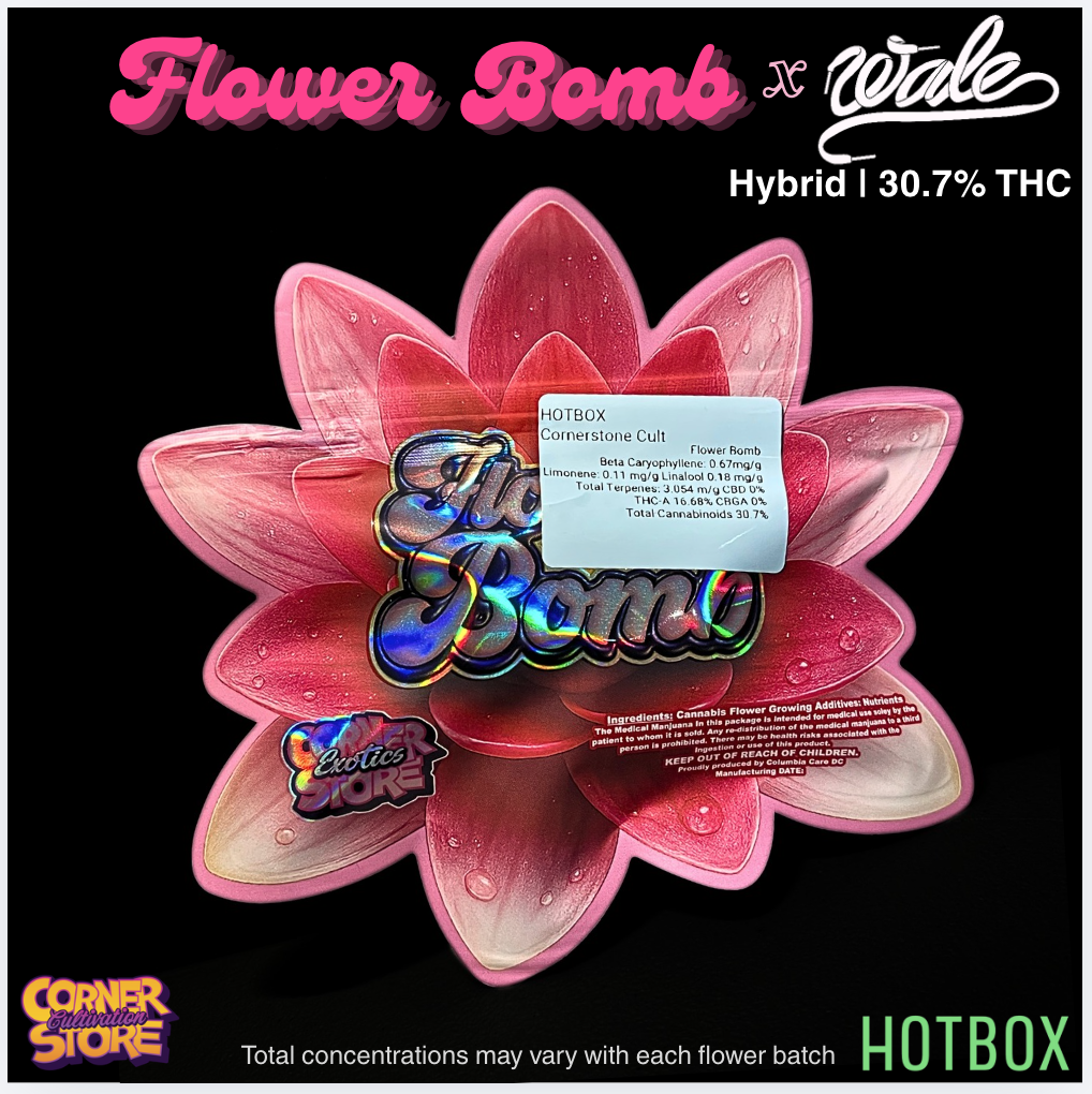 Flower Bomb x Wale by Cornerstore Cultivation is DC’s hottest collaboration. True to its name, Flower Bomb explodes with sweet floral aromatics layered with hints of tropical fruit and light gas. This balanced hybrid delivers an uplifting, euphoric head high followed by smooth, calming body relaxation, making it a go-to for stress relief, social vibes, or an easy anytime smoke.