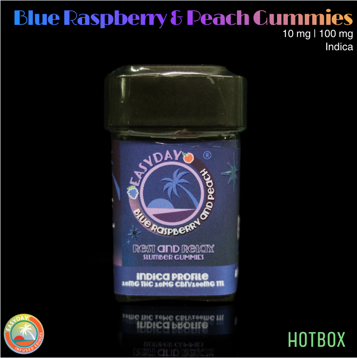 Rest & Relax Gummies (10 mg/100 mg) by EasyDay Edibles offer restorative sleep with blue raspberry and peach slumber gummies. These specially formulated chews feature a balanced 1:1 CBN:THC ratio enhanced with myrcene for deep, natural sleep. Wake up refreshed without grogginess.
