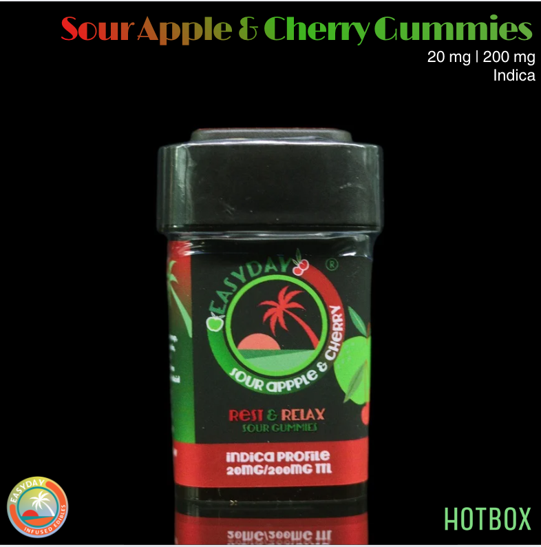 Rest and Relax Gummies (20 mg/200 mg) by EasyDay Edibles offer a tangy fusion of sour green apple and juicy ripe cherry, these vegan gummies deliver a smooth indica-leaning unwind. Crafted to ease stress while keeping your mind gently lifted, they’re perfect for turning down the day without logging off entirely.