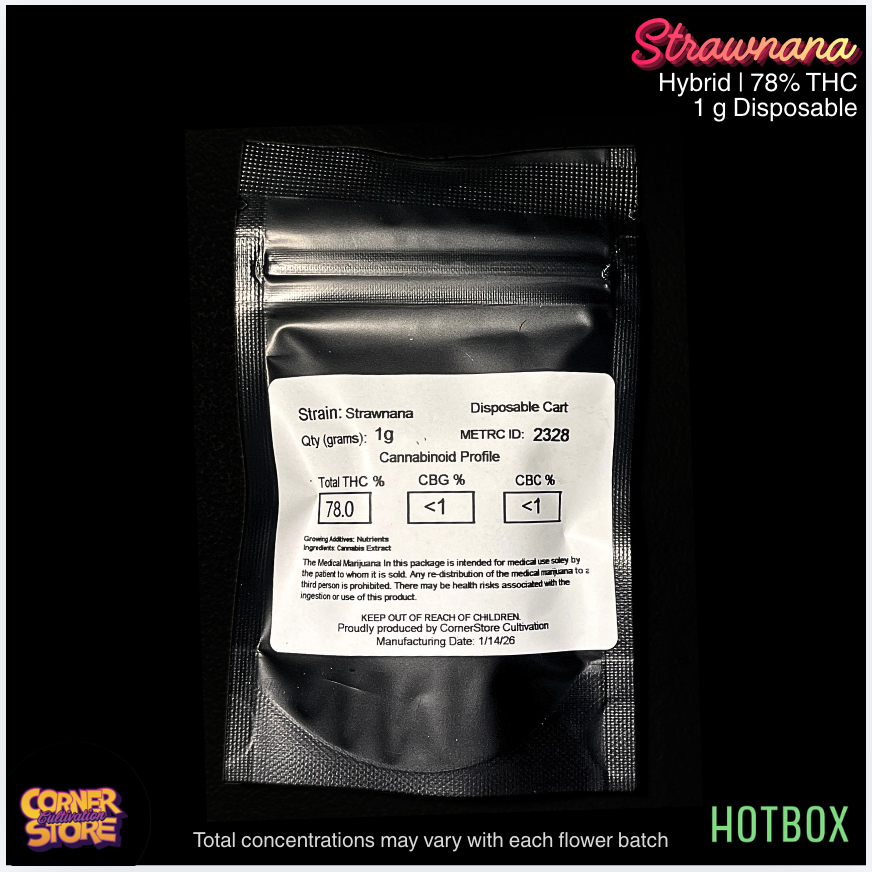 Strawnana Disposable Vape (1 g) by Cornerstore Cultivation is a hybrid, top-shelf kandy vape bred from Banana Kush × Strawberry genetics, delivering sweet strawberry candy layered with creamy banana notes. The effects are deeply relaxing yet mentally uplifting, offering a euphoric head high followed by smooth, calming body relief. A flavorful, crowd-favorite disposable perfect for winding down without feeling weighed down.